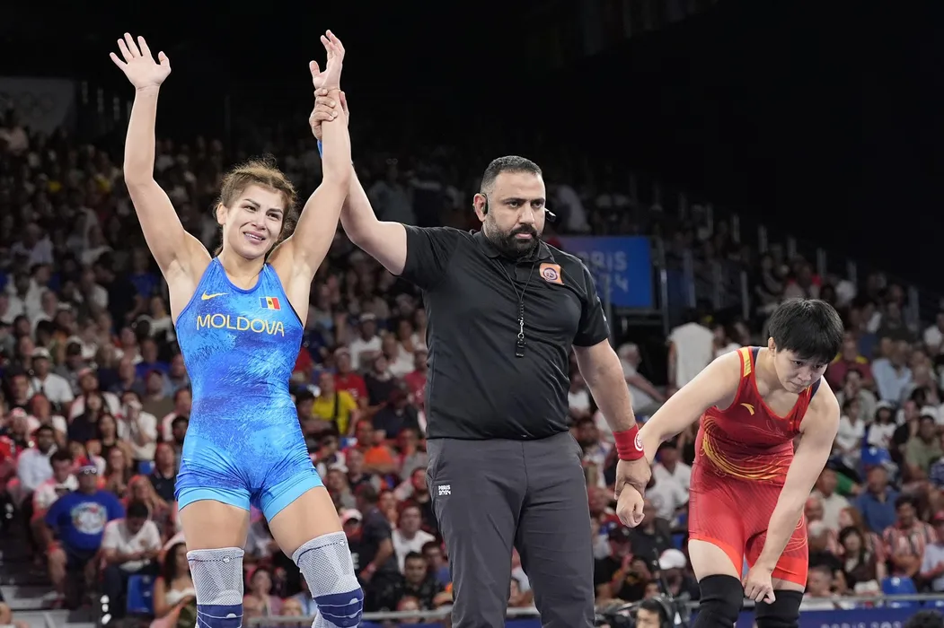 Moldova's Anastasia Nichita celebrates after defeating China's Kexin Hong in their women's freestyle 57kg semifinal wrestling match, at Champ-de-Mars Arena, during the 2024 Summer Olympics, Thursday, Aug. 8, 2024, in Paris, France.,Image: 897114851, License: Rights-managed, Restrictions: This content is intended for editorial use only. For other uses, additional clearances may be required., Model Release: no