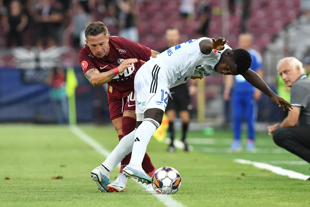 Ciprian Deac (S), de la CFR Cluj, lupta pentru balon cu Friday Adams (D), de la FC Botosani, in timpul meciului de fotbal din etapa a VII-a a Superligii, disputat pe stadionul Dr. Constantin Radulescu din Cluj-Napoca, sambata, 26 august 2023. FLAVIU BUBOI / MEDIAFAX FOTO