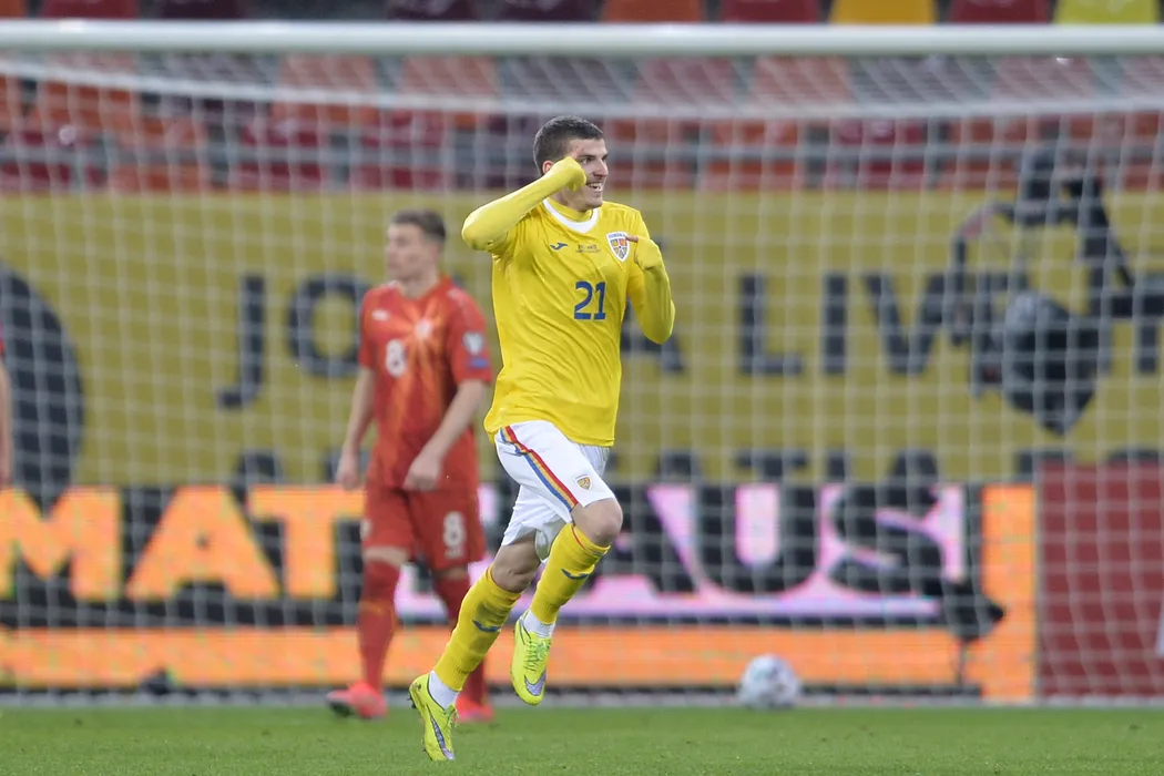 Reprezentativele Romaniei (echipament galben) si Macedoniei de Nord s-au intalnit intr-o partida contand pentru preliminariile CM 2022, joi 25 noiembrie 2021, pe Arena Nationala din Bucuresti. ALEXANDRU DOBRE / MEDIAFAX FOTO