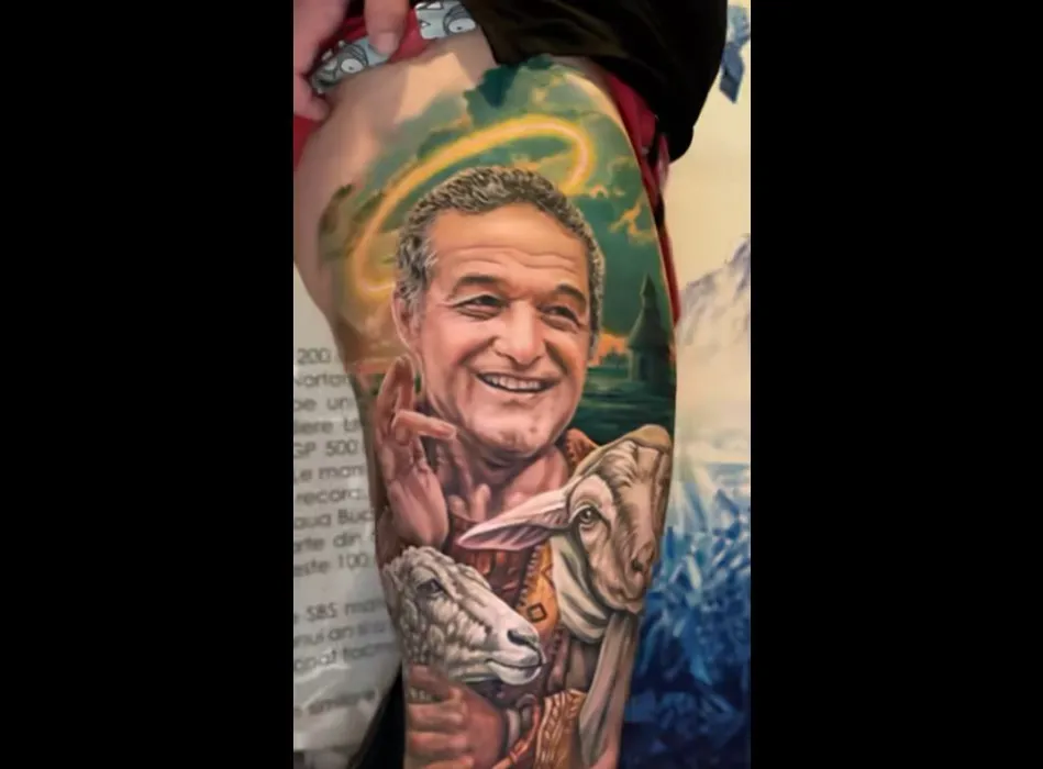 Tatuajul obscen cu Gigi Becali, devenit viral pe internet! Un ultras și-a făcut un desen cu miliardarul din Pipera, sub formă de sfânt, și două oi