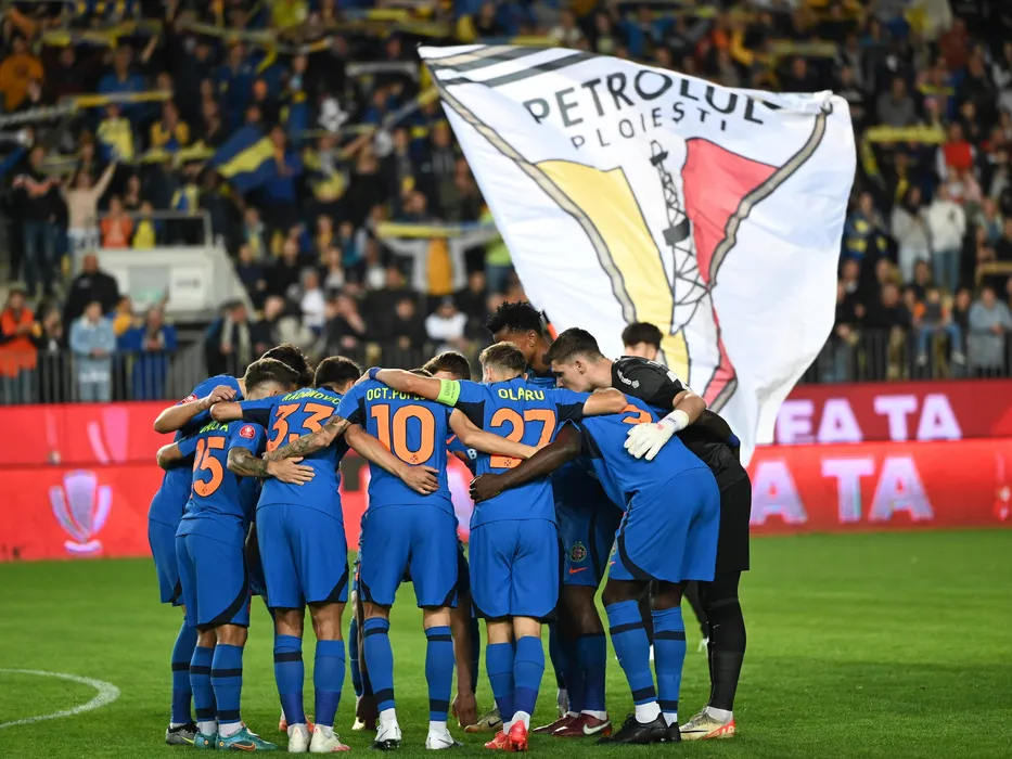 Fotbalistii stelisti se incurajeaza inaintea meciului de fotbal dintre Petrolul Ploiesti si FCSB, din cadrul Superligii Superbet, desfasurat pe Stadionul Ilie Oana din Ploiesti, sambata 28 octombrie 2023. © FOTO:Razvan Pasarica/SPORT PICTURES