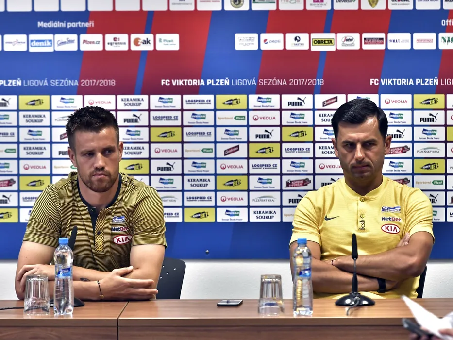 Nicolae Dica si Mihai Pintilii la conferinta de presa a echipei FCSB inaintea meciului impotriva celor de la Viktoria Plzen din cadrul preliminariilor Ligii Campionilor,desfasurata la Arena Doosan din Plzen, marti 1 august 2017. Razvan Pasarica/SPORT PICTURES