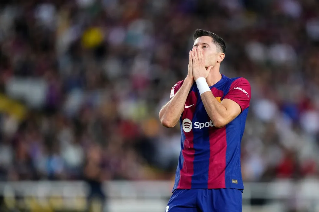 Robert Lewandowski centre-forward of Barcelona and Poland lament a failed occasion during the LaLiga EA Sports match between FC Barcelona and Celta Vigo at Estadi Olimpic Lluis Companys on September 23, 2023 in Barcelona, Spain. FC Barcelona v Celta Vigo - LaLiga EA Sports, Spain - 23 Sep 2023,Image: 807909722, License: Rights-managed, Restrictions: RESTRICTED TO EDITORIAL USE, Model Release: no
