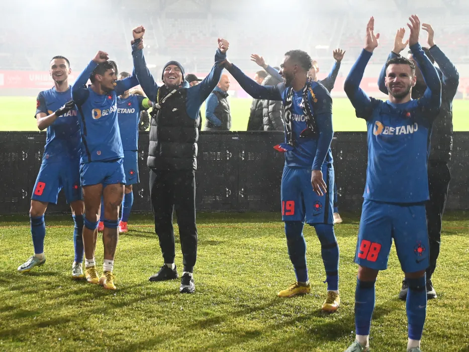 Fotbalistii stelisti Florinel Teodor Coman, Florinel Teodor Coman, Deian Cristian Sorescu, Abdel Slem Billel Omrani si Andrei Ioan Cordea saluta galeria dupa meciul de fotbal dintre FC Hermannstadt si FCSB, contand pentru Superliga Superbet, desfasurat pe Stadionul Municipal din Sibiu, duminica 22 ianuarie 2023. © FOTO:Razvan Pasarica/SPORT PICTURES