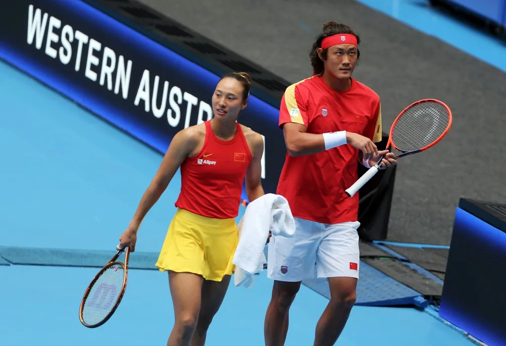 PERTH, Dec. 30, 2023 -- Zheng Qinwen(L)/Zhang Zhizhen of China take a break during the mixed doubles match against Marketa Vondrousova/Jiri Lehecka of the Czech Republic at the 2024 United Cup group E match between China and the Czech Republic, in Perth, Australia, on Dec. 30, 2023.,Image: 833258859, License: Rights-managed, Restrictions: , Model Release: no
