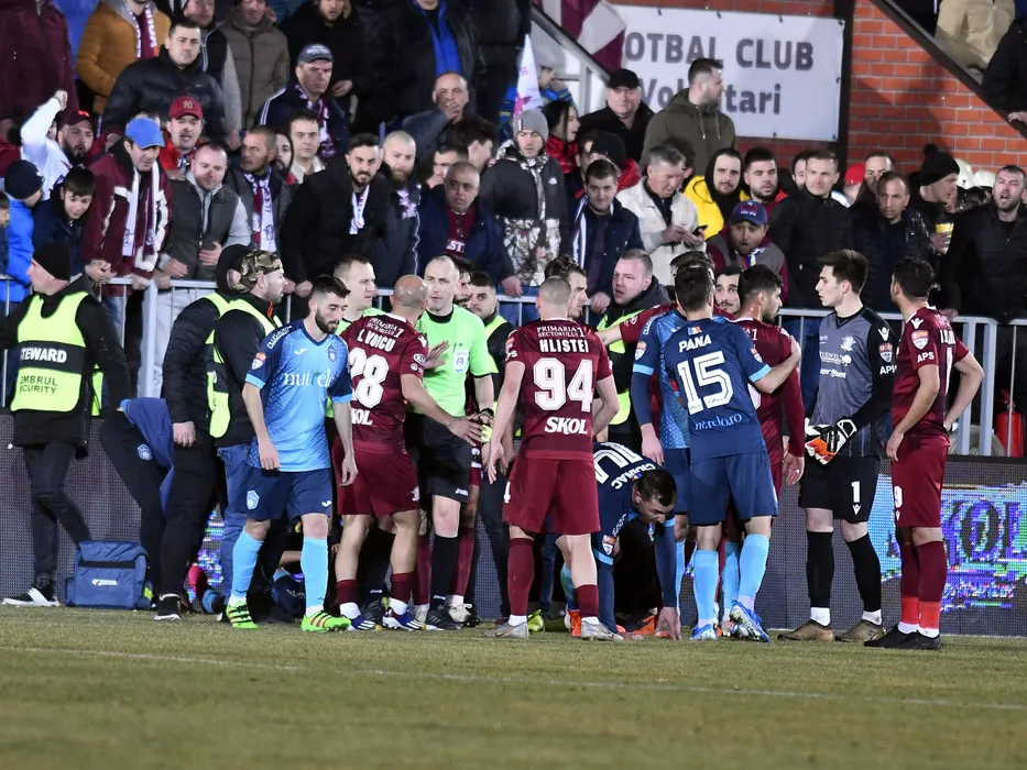 Nebunie la Voluntari. Fanii Rapidului au luat foc după eliminarea lui Ionuț Voicu, iar jandarmii și-au făcut apariția la marginea terenului | VIDEO