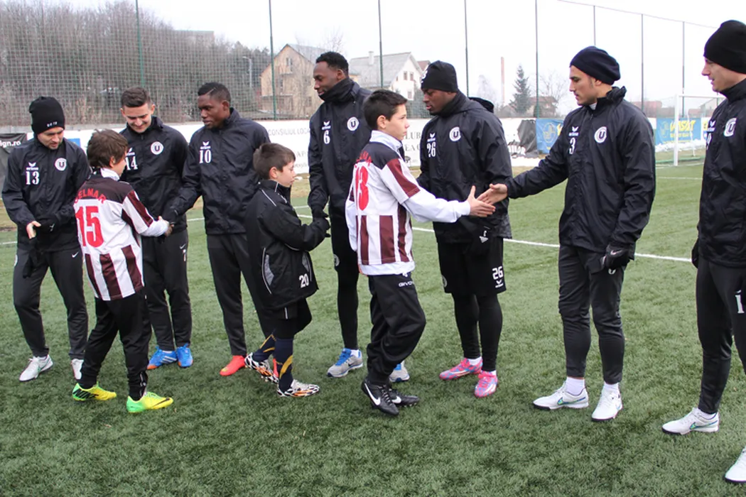 Terapie prin fotbal. Copiii militarilor decedați în accidentului aviatic de la Sibiu au schimbat pase cu vedetele de la „U” Cluj
