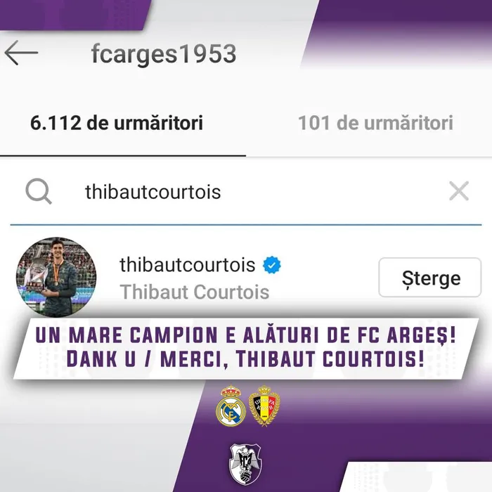 Thibaut Courtois, portarul lui Real Madrid, fanul lui FC Argeș. „Ne-a făcut o surpriză și a devenit parte a familiei vulturilor alb-violeți!” | FOTO