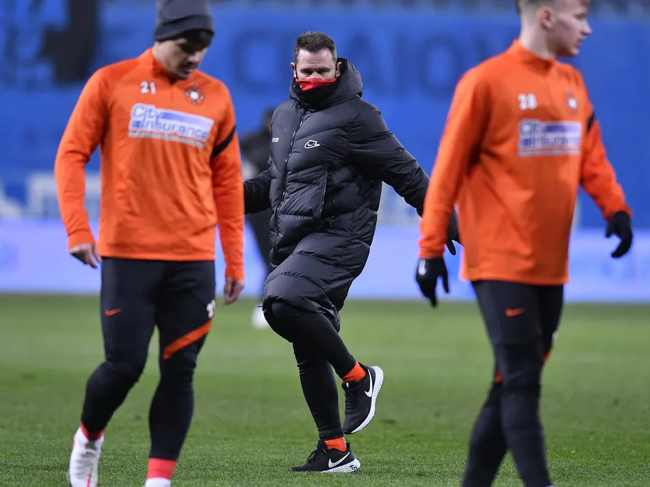 Preparatorul fizic Thomas Neubert lucreaza alaturi de fotbalistii stelisti in pauza meciului de fotbal dintre Universitatea Craiova si FCSB, contand pentru Liga 1 Casa Pariurilor, desfasurat fara spectatori pe Stadionul Ion Oblemenco din Craiova, vineri 18 decembrie 2020. © FOTO:Razvan Pasarica/SPORT PICTURES