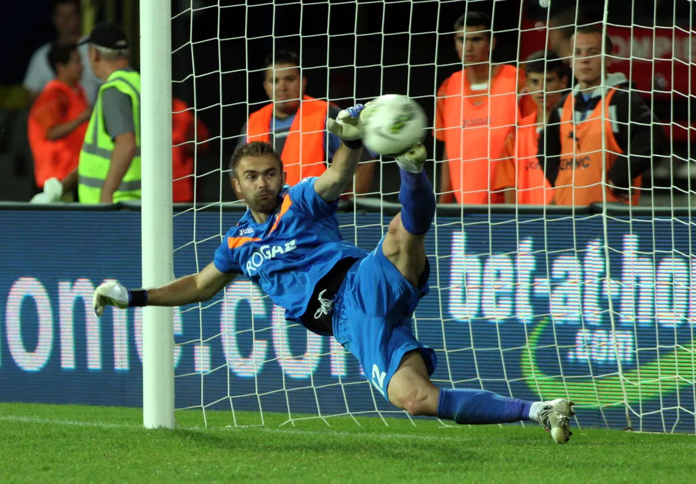 Razvan Plesca, portar la Gaz Metan Medias, respinge un balon, in timpul meciului cu FSV Mainz (Germania), din mansa secunda a turului trei preliminar al Ligii Europa, in Medias, joi, 4 august 2011. ALEKSANDAR DJOROVIC / MEDIAFAX FOTO