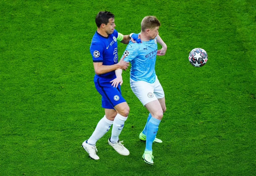 Kevin De Bruyne of Manchester City and Cesar Azpilicueta of Chelsea challenge for the ball