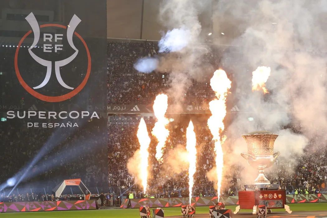 Fireworks go off before the start of the Spanish Super Cup final football match between Real Madrid CF and FC Barcelona at the King Fahd International Stadium in Riyadh, Saudi Arabia, on January 15, 2023.,Image: 749861162, License: Rights-managed, Restrictions: , Model Release: no
