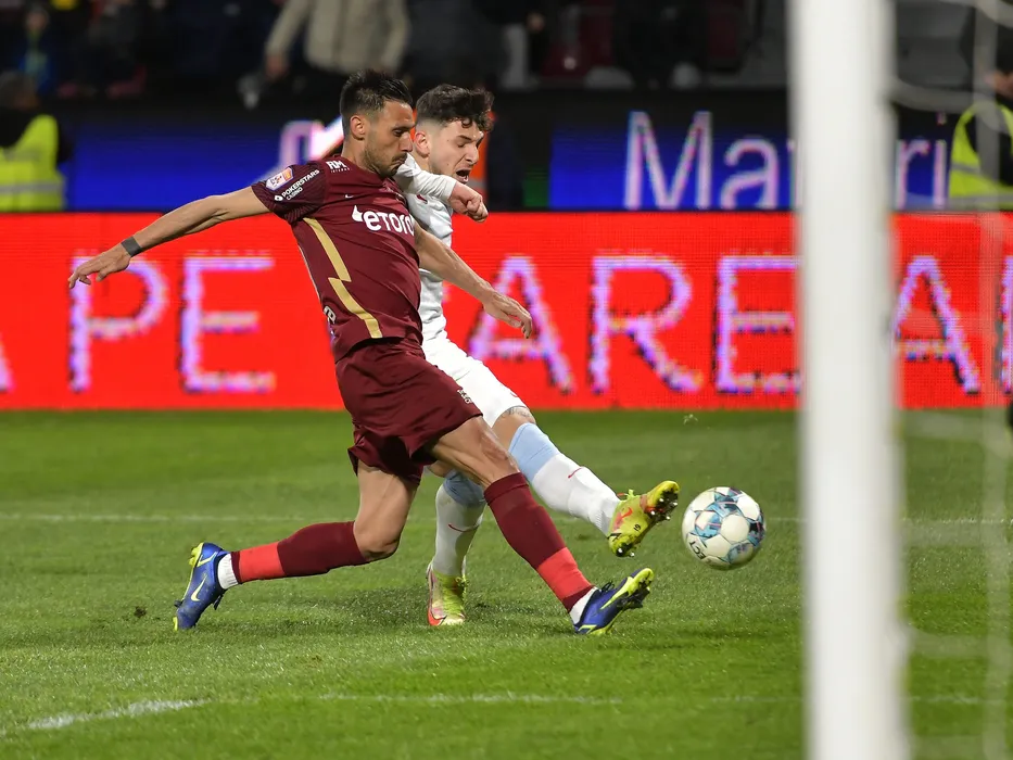 Mario Camora si Ianis Ilie Stoica in meciul de fotbal dintre CFR Cluj si FCSB, contand pentru Play-off-ul Ligii 1 Casa Pariurilor, desfasurat pe Stadionul CFR Dr. Constantin Radulescu din Cluj Napoca, duminica 17 aprilie 2022. © FOTO:Razvan Pasarica/SPORT PICTURES