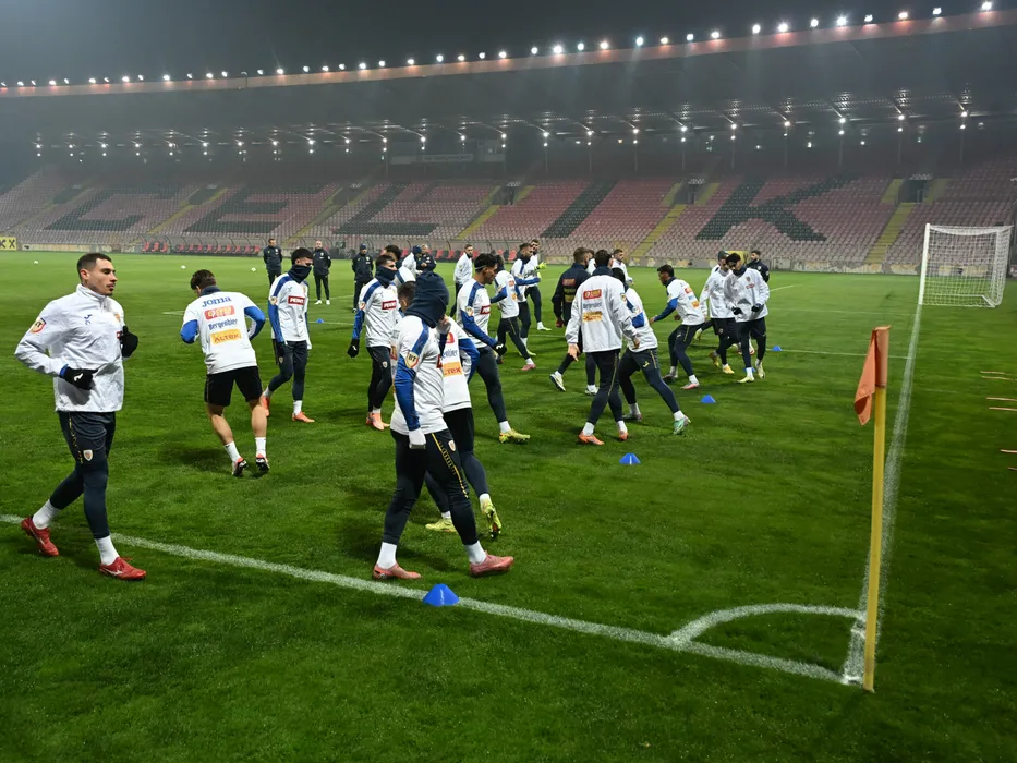 Fotbalistii romani printre care Bogdan Racovitan, Valentin Mihaila si Lisav Naif Eissat la antrenamentul oficial efectuat inaintea meciului impotriva Bosniei Hertegovina, din cadrul Preliminariilor Campionatului Mondial 2026, desfasurat pe Stadionul Bilino Polje din Zilina, vineri 14 noiembrie 2025. © FOTO:Razvan Pasarica/SPORT PICTURES