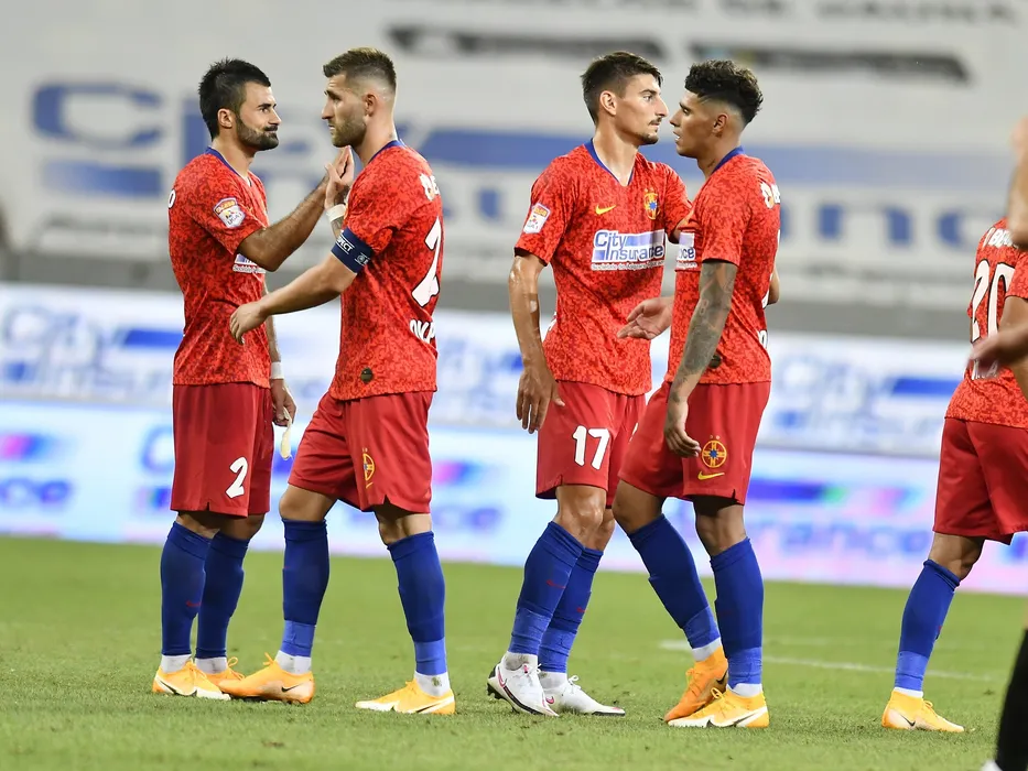 Fotbalistii stelisti Ionut Daniel Vina, Iulian Lucian Cristea, Ovidiu Marian Popescu si Florinel Teodor Coman se felicita dupa meciul de fotbal dintre FCSB si FC Shirak, contand pentru turul 1 preliminar din cadrul Ligii Europa, desfasurat fara spectatori pe Arena Nationala din Bucuresti, joi 27 august 2020. © FOTO:Razvan Pasarica/SPORT PICTURES