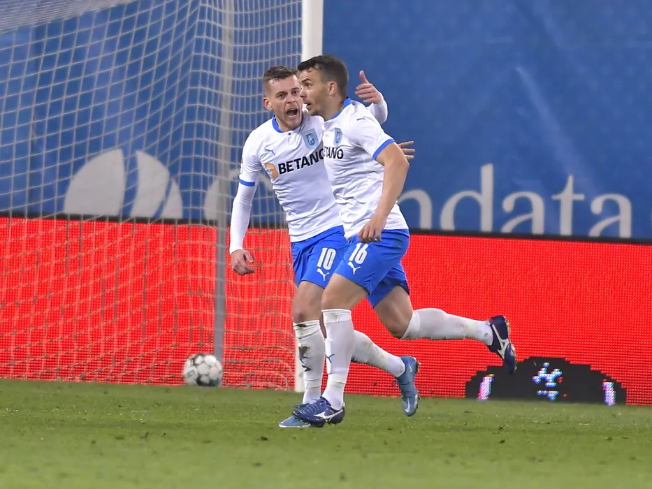Alexandru Cicaldau si Dan Nicolae Nistor se bucura dupa un gol marcat in meciul de fotbal dintre Universitatea Craiova si FCSB, contand pentru Play-off-ul Ligii 1 Casa Pariurilor, desfasurat fara spectatori pe Stadionul Ion Oblemenco din Craiova, joi 29 aprilie 2021. © FOTO:Razvan Pasarica/SPORT PICTURES
