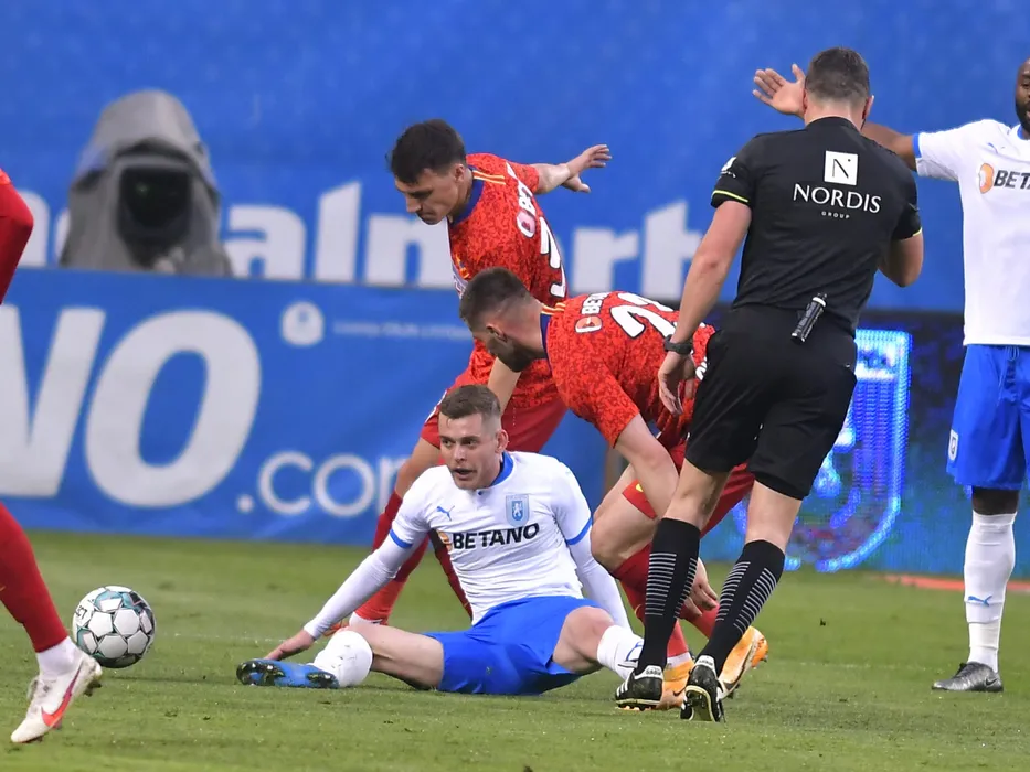 Alexandru Cicaldau si Risto Radunovic in meciul de fotbal dintre Universitatea Craiova si FCSB, contand pentru Play-off-ul Ligii 1 Casa Pariurilor, desfasurat fara spectatori pe Stadionul Ion Oblemenco din Craiova, joi 29 aprilie 2021. © FOTO:Razvan Pasarica/SPORT PICTURES