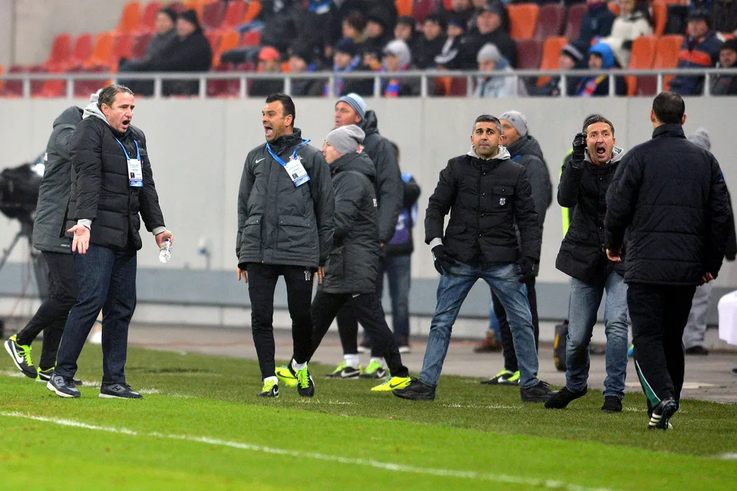 Antrenorul stelist Laurentiu Reghecampf (S), alaturi de Anton Petrea, Marius Ianuli si Mihai Stoica reactioneaza in meciul cu Astra Giurgiu, din etapa a XIX-a a Ligii I, disputat in Bucuresti, miercuri, 18 decembrie 2013. LAURENTIU MICH / MEDIAFAX FOTO