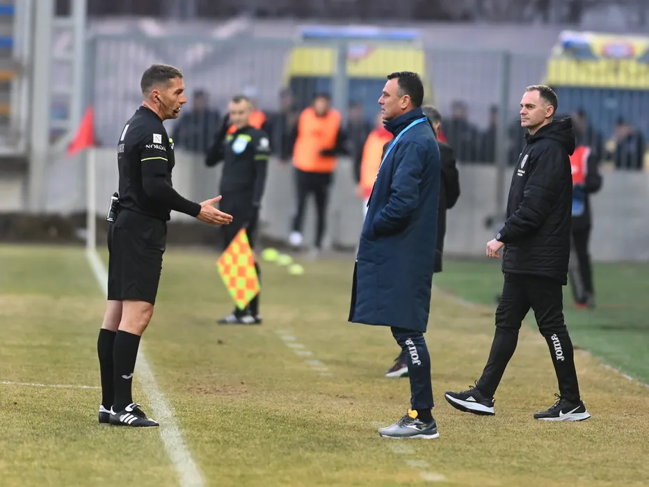 Arbitrul central Istvan Kovacs discuta cu Toni Petrea sub privirile arbitrului de rezerva Lucian Rusandu in meciul de fotbal dintre Chindia Targoviste si Universitatea Cluj, contand pentru Superliga Superbet, desfasurat pe Stadionul Ilie Oana din Ploiesti, vineri 17 februarie 2023. © FOTO:Razvan Pasarica/SPORT PICTURES