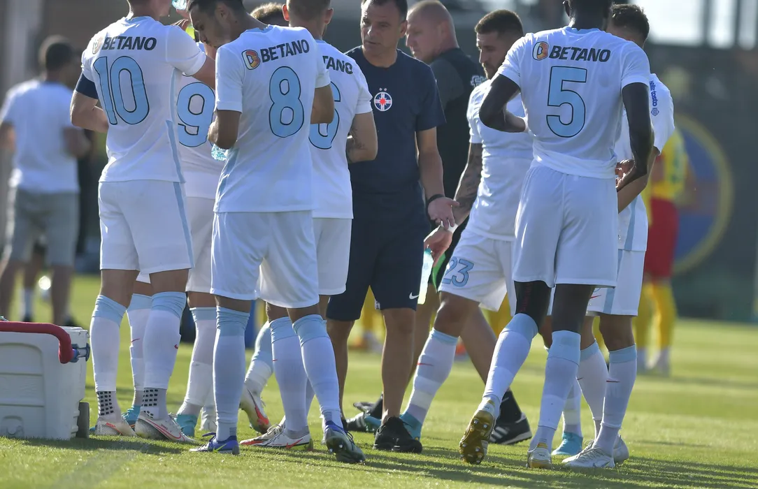 Fotbalistii stelisti la o pauza de hidratare alaturi de antrenorul lor Toni Petrea in meciul amical de fotbal dintre FCSB si CS Mioveni, desfasurat la Baza FCSB din Berceni, miercuri 6 iulie 2022. © FOTO:Razvan Pasarica/SPORT PICTURES