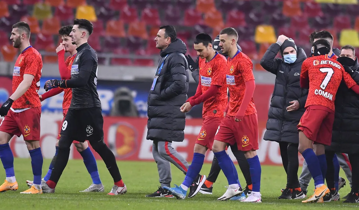 Fotbalistii stelisti alaturi de staff-ul condus de catre Toni Petrea se bucura dupa meciul de fotbal dintre FCSB si Astra Giurgiu, contand pentru Liga 1 Casa Pariurilor, desfasurat fara spectatori pe Arena Nationala din Bucuresti, vineri 15 ianuarie 2021. © FOTO:Razvan Pasarica/SPORT PICTURES