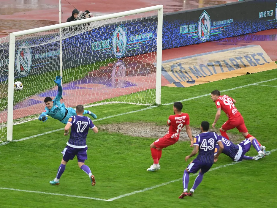 Grigore Ioan Turda marcheaza un gol in poarta lui Catalin Vasile Cabuz la meciul de fotbal dintre FC Arges si Chindia Targoviste, contand pentru Play-out-ul Superligii Superbet, desfasurat pe Stadionul Nicolae Dobrin din Pitesti, luni 17 aprilie 2023. © FOTO:Razvan Pasarica/SPORT PICTURES