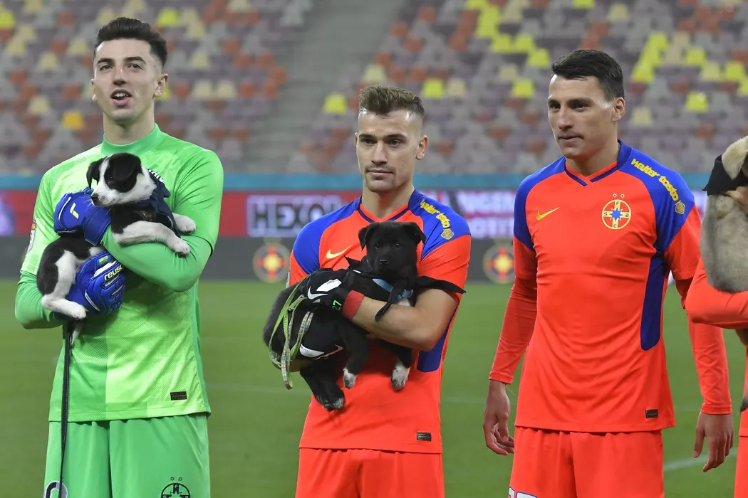 Andrei Daniel Vlad si Darius Dumitru Olaru cu catei in brate alaturi de Risto Radunovic la meciul de fotbal dintre FCSB si UTA Arad, contand pentru Liga 1 Casa Pariurilor, desfasurat pe Arena Nationala din Bucuresti, duminica 5 decembrie 2021. © FOTO:Razvan Pasarica/SPORT PICTURES