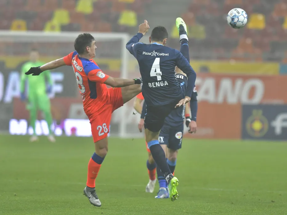 Claudiu Andrei Keseru si Alexandru Constantin Benga in meciul de fotbal dintre FCSB si UTA Arad, contand pentru Liga 1 Casa Pariurilor, desfasurat pe Arena Nationala din Bucuresti, duminica 5 decembrie 2021. © FOTO:Razvan Pasarica/SPORT PICTURES