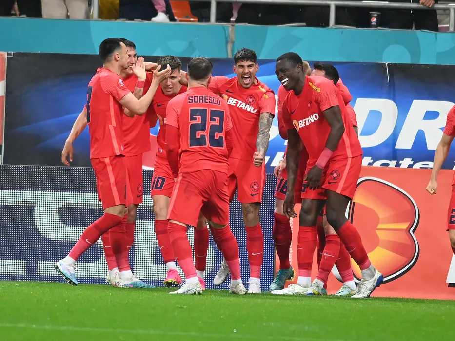 Bucurie a fotbalistilor stelisti dupa un gol marcat cu Adrian Gheorghe Sut, Risto Radunovic, Octavian George Popescu, Florinel Teodor Coman si Joyskim Aurelien Dawa Tchakonte in meciul de fotbal dintre FCSB si Sepsi OSK Sfantu Gheorghe, contand pentru Play-off-ul Superligii Superbet, desfasurat pe Arena Nationala din Bucuresti, luni 8 mai 2023. © FOTO:Razvan Pasarica/SPORT PICTURES