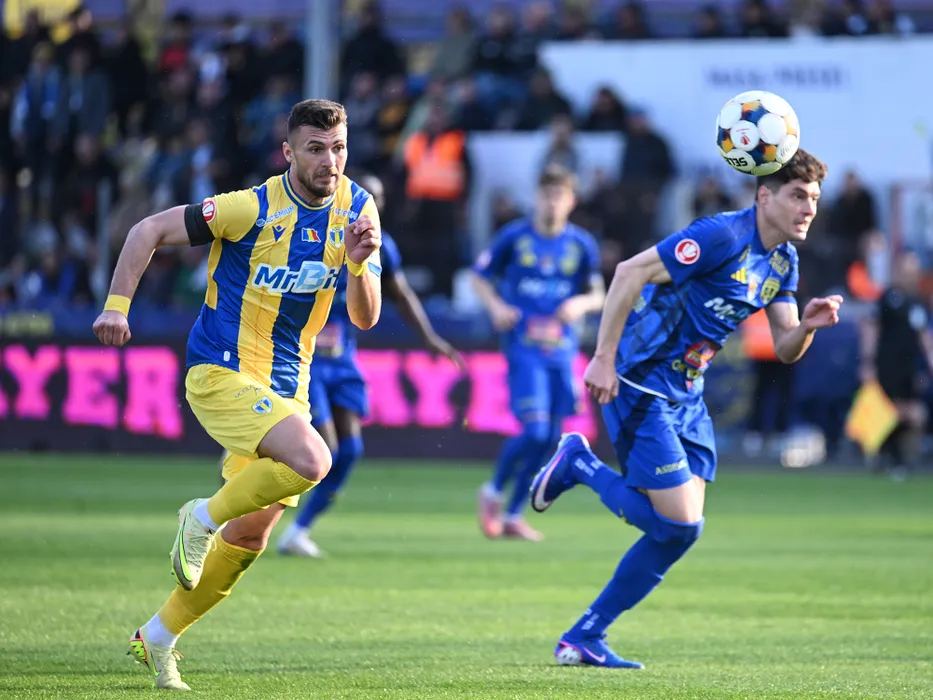 Adi Marian Chica Rosa si Marius Paul Antoche in meciul dintre Unirea Slobozia si Petrolul Ploiesti, contand pentru Play out-ul Superligii Superbet, desfasurat pe Stadionul 1 Mai din Slobozia, duminica 12 aprilie 2026. © FOTO:Razvan Pasarica/SPORT PICTURES