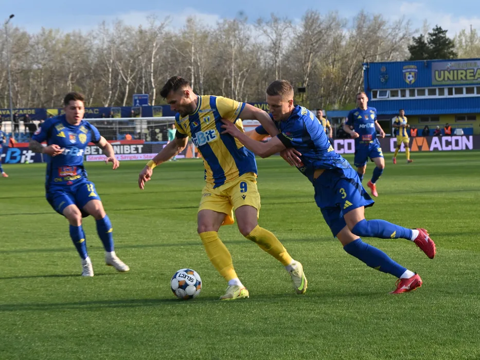 Adi Marian Chica Rosa si Oleksandr Safronov in meciul dintre Unirea Slobozia si Petrolul Ploiesti, contand pentru Play out-ul Superligii Superbet, desfasurat pe Stadionul 1 Mai din Slobozia, duminica 12 aprilie 2026. © FOTO:Razvan Pasarica/SPORT PICTURES