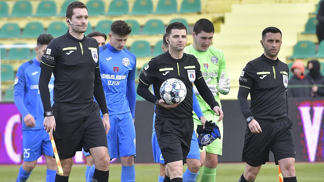 Brigada de arbitri formata din Adrian Vornicu, Bogdan Dumitrache si Ionut Marius Bobe intra pe teren la meciul de fotbal dintre CS Mioveni si Academica Clinceni, contand pentru Liga 1 Casa Pariurilor, desfasurat pe Stadionul Orasenesc din Mioveni, duminica 23 ianuarie 2022. © FOTO:Razvan Pasarica/SPORT PICTURES