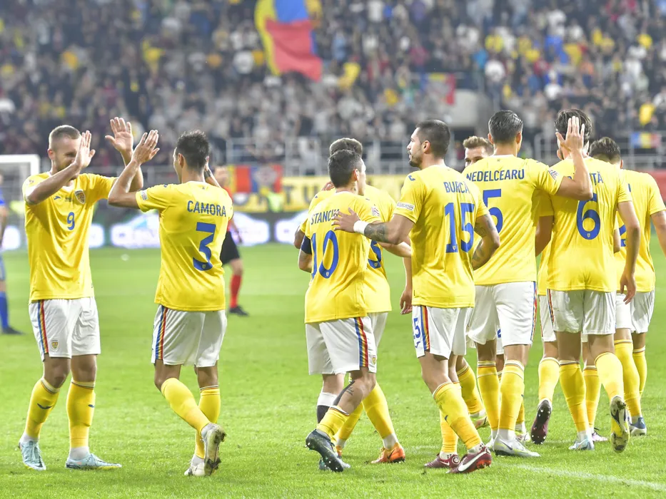 Bucurie a fotbalistilor romani dupa un gol marcat cu George Pușcaș, Mario Camora si Andrei Burcă in meciul de fotbal dintre Romania si Bosnia Hertegovina, contand pentru Liga Natiunilor, desfasurat pe Stadionul Rapid Giulesti din Bucuresti, luni 26 septembrie 2022. © FOTO:Razvan Pasarica/SPORT PICTURES