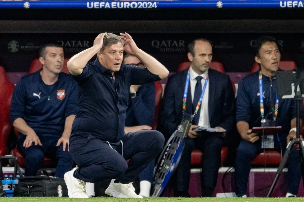 Serbia's head coach Dragan Stojkovic gestures during the UEFA Euro 2024 Group C football match between Denmark and Serbia at the Munich Football Arena in Munich on June 25, 2024.,Image: 884677357, License: Rights-managed, Restrictions: , Model Release: no
