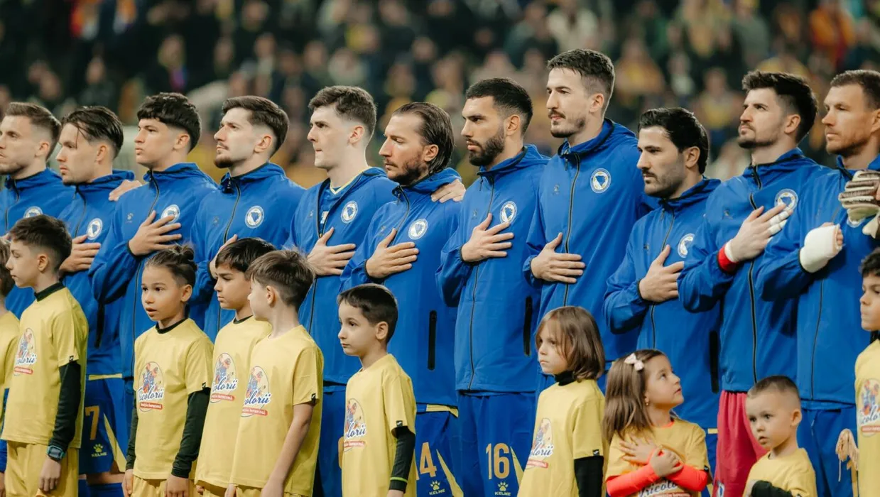 Jucătorii bosniaci, înaintea meciului cu România. | Foto: Profimedia Images (25.03.2025)