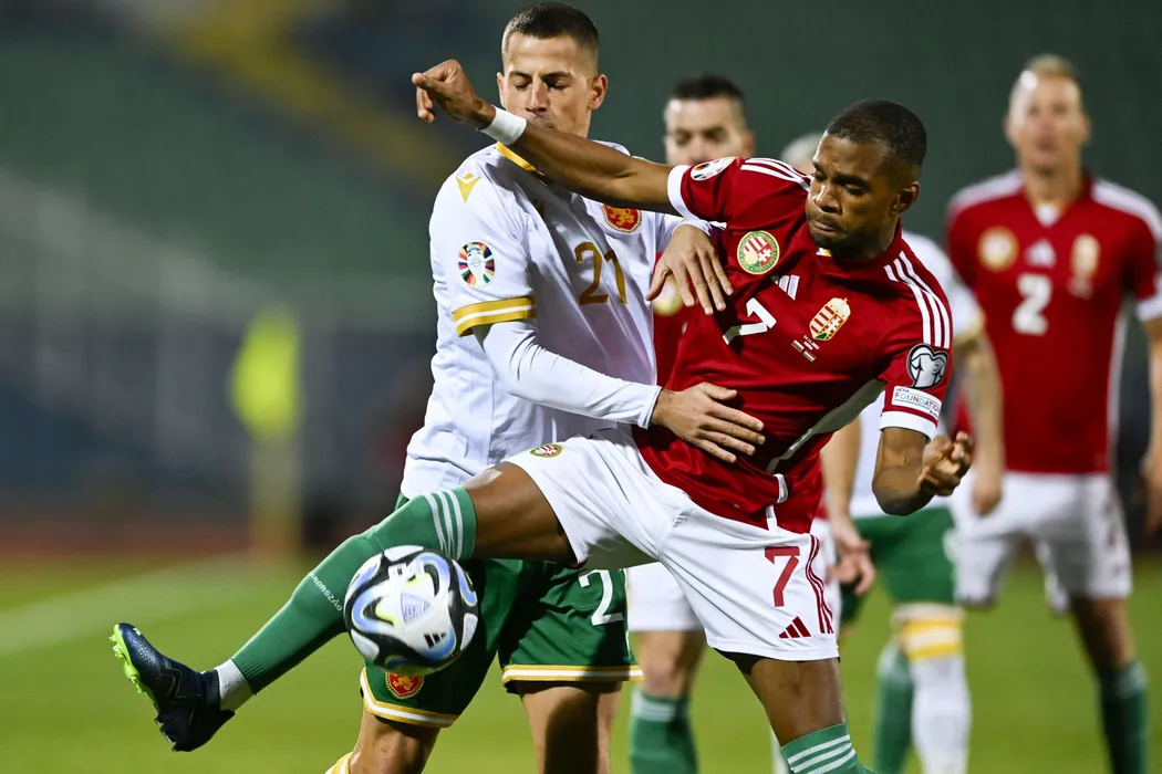 Hungary's defender #07 Loic Nego (CR) fights for the ball with Bulgaria's forward #21 Martin Minchev (CL) during the UEFA Euro 2024 Group G qualification football match between Bulgaria and Hungary, at the Vassil Levski Stadium in Sofia, on November 16, 2023.,Image: 822462226, License: Rights-managed, Restrictions: , Model Release: no
