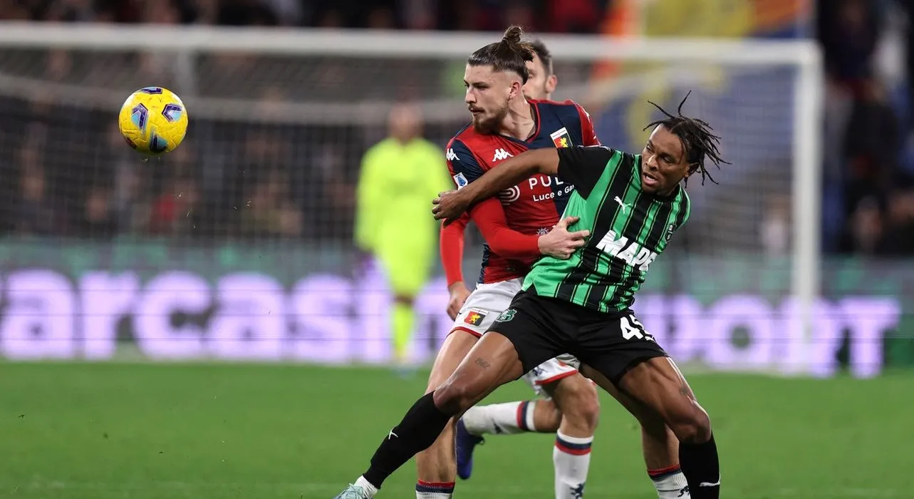Radu Dragusin (Genoa)Armand Lauriente (Sassuolo) during the Italian "Serie A match between Sassuolo 1-2 Genoa at Mapei Stadium on December 22, 2023 in Reggio Emilia, Italy. (Photo by Maurizio Borsari/AFLO),Image: 831944859, License: Rights-managed, Restrictions: No third party sales, Model Release: no