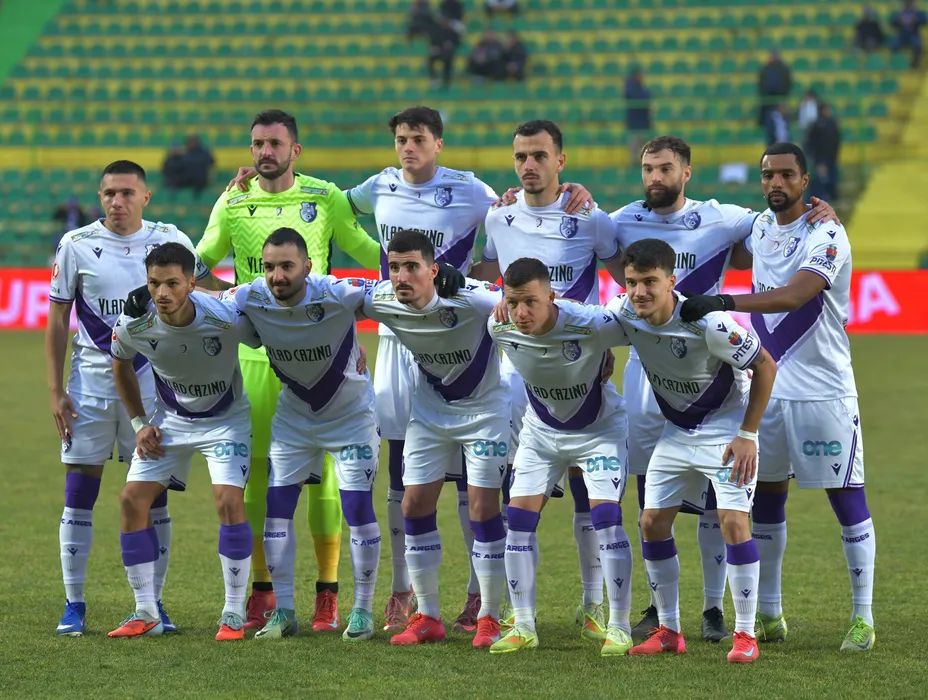 Fotbalistii argeseni la o fotografie de grup realizata inaintea meciului de fotbal dintre FC Arges si AFC Hermannstadt, contand pentru Superliga Superbet, desfasurat pe Stadionul Orasenesc din Mioveni, vineri 6 februarie 2026. © FOTO:Mihai Nitoiu/SPORT PICTURES