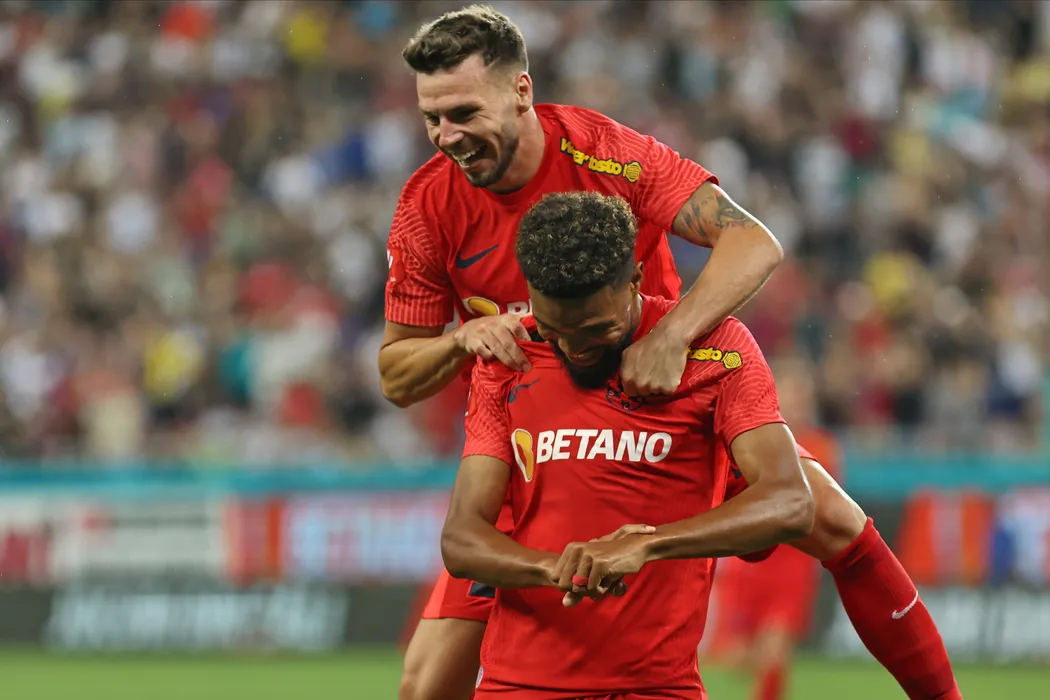 Malcom Edjouma si Andrei Cordea in meciul de fotbal dintre FCSB si Saburtalo Tbilisi, contand pentru turul 2 preliminar al Conference League, desfasurat pe Arena Nationala din Bucuresti, joi 28 iulie 2022. © FOTO:Gheorghe Fluster/SPORT PICTURES