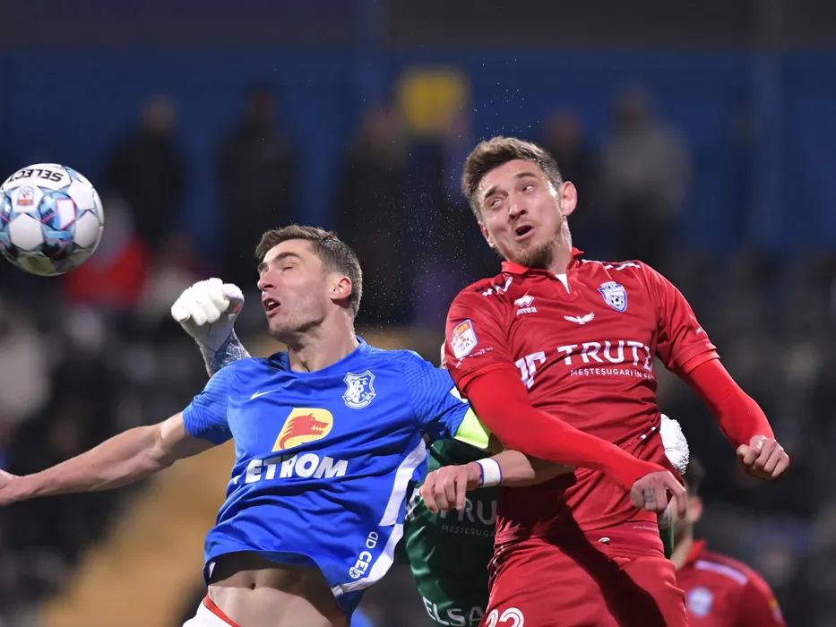 Ionut Justinian Larie si Alin Ioan Seroni in meciul de fotbal dintre Farul Constanta si FC Botosani, contand pentru Liga 1 Casa Pariurilor, desfasurat pe Stadionul central al Academiei Gheorghe Hagi din Ovidiu, joi 3 martie 2022. © FOTO:Razvan Pasarica/SPORT PICTURES