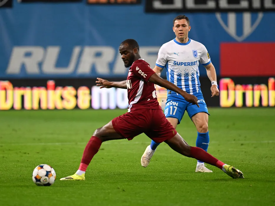 Aly Abeid si Carlos Andrei Mora Montoya in meciul de fotbal dintre Universitatea Craiova si CFR Cluj, contand pentru Play off-ul Superligii Superbet, desfasurat pe Stadionul Ion Oblemenco din Craiova, luni 6 aprilie 2026. © FOTO:Razvan Pasarica/SPORT PICTURES