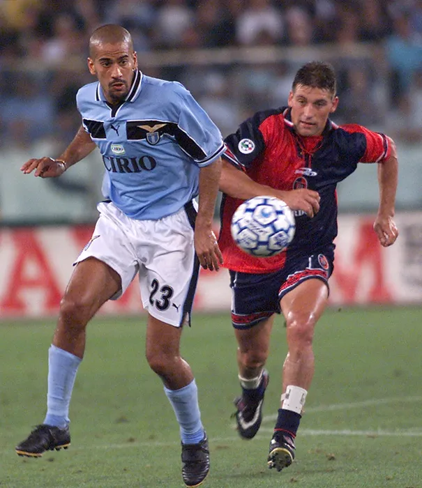 Lazio Roma's midfielder Argentinian Juan Sebastian Veron (L) fights for the ball with Cagliari's midfielder Urugayan Fabian O'Neill (R) during their Italian Serie A game 30 august 1999 at the Olympic Stadium in Rome. (ELECTRONIC IMAGE),Image: 68797343, License: Rights-managed, Restrictions: , Model Release: no