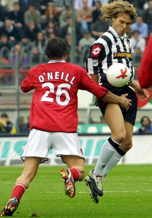Pavel Nedvěd z Juventusu Turín a hráč domácího celku Fabian Alberto O'Neill v utkání italské fotbalové ligy, které se hrálo 7. dubna v Perugii.,Image: 670609958, License: Rights-managed, Restrictions: , Model Release: no