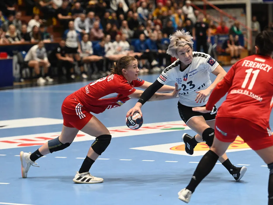 Anikó Kovacs si Iryna Glibko in meciul de handbal feminin dintre SCM Ramnicu Valcea si Praktiker Vac, contand pentru EHF European League, desfasurat in Sala Traian din Ramnicu Valcea, duminica 8 ianuarie 2023. © FOTO:Razvan Pasarica/SPORT PICTURES
