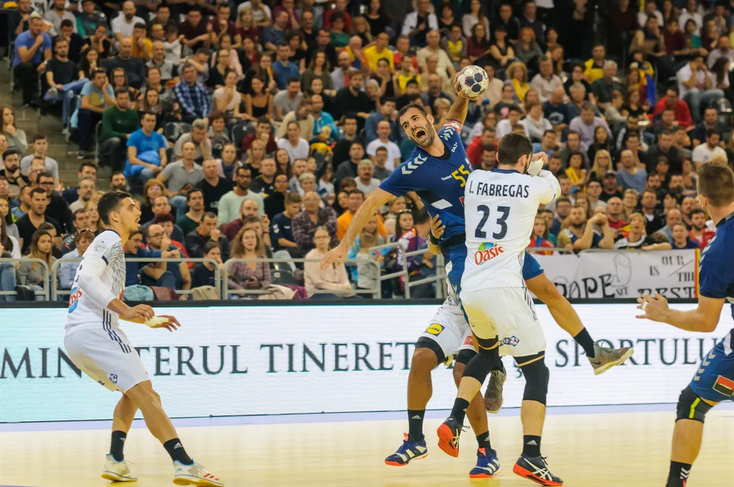Javier Humet Gaminde (C), de la nationala de handbal a Romaniei, arunca la poarta in meciul contra selectionatei Frantei din cea de-a doua etapa a grupei 6 din cadrul preliminariilor EURO 2020, disputat la Sala Polivalenta din Cluj-Napoca, duminica, 28 octombrie 2018. DAN HORIA TAUTAN / MEDIAFAX FOTO