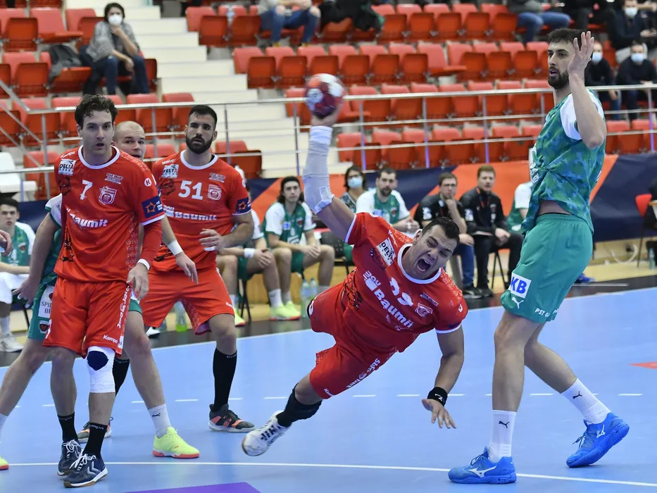 Stefan Vujic, Javier Gaminde Humet si Mohamed Shebib Ashem Mamdouh in meciul de handbal masculin dintre Dinamo Bucuresti si Fuchse Berlin, contand pentru Liga Europeana EHF, desfasurat fara spectatori in Sala Dinamo din Bucuresti, marti 8 decembrie 2020. © FOTO:Razvan Pasarica/SPORT PICTURES