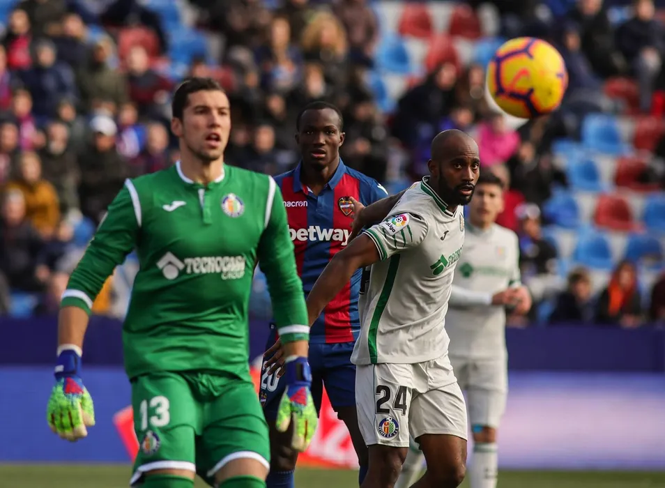 David Soria, Dwamena and Foulquier during the football match between Levante UD and Getafe CF on Febrary 2, 2019 at Ciutat de Valencia in Valencia, Spain.