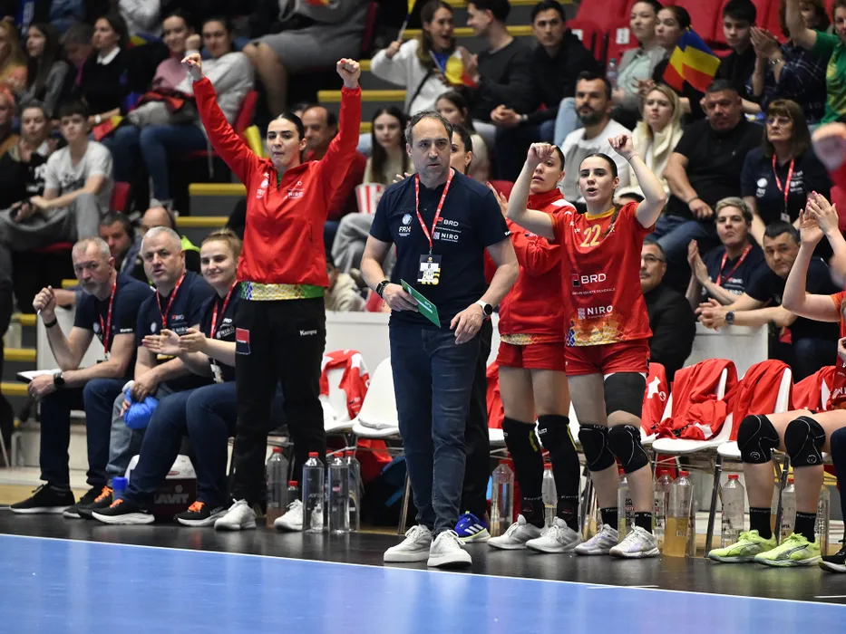 Ovidiu Mihai Mihaila si Costinela Beatrice Raicea reactioneaza pe banca romaneasca la meciul de handbal feminin dintre Romania si Norvegia, din cadrul EHF Euro Cup 2026, desfasurat in Sala Polivalenta Ioan Kunst Ghermanescu din Bucuresti, miercuri 8 aprilie 2026. © FOTO:Razvan Pasarica/SPORT PICTURES