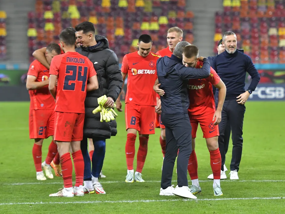 Fotbalistii stelisti Andrei Daniel Vlad, Adrian Gheorghe Sut si Denis Gratian Harut se bucura alaturi de Mihai Stoica dupa meciul de fotbal dintre FCSB si Rapid Bucuresti, contand pentru Superliga Superbet, desfasurat pe Arena Nationala din Bucuresti, duminica 6 noiembrie 2022. © FOTO:Razvan Pasarica/SPORT PICTURES