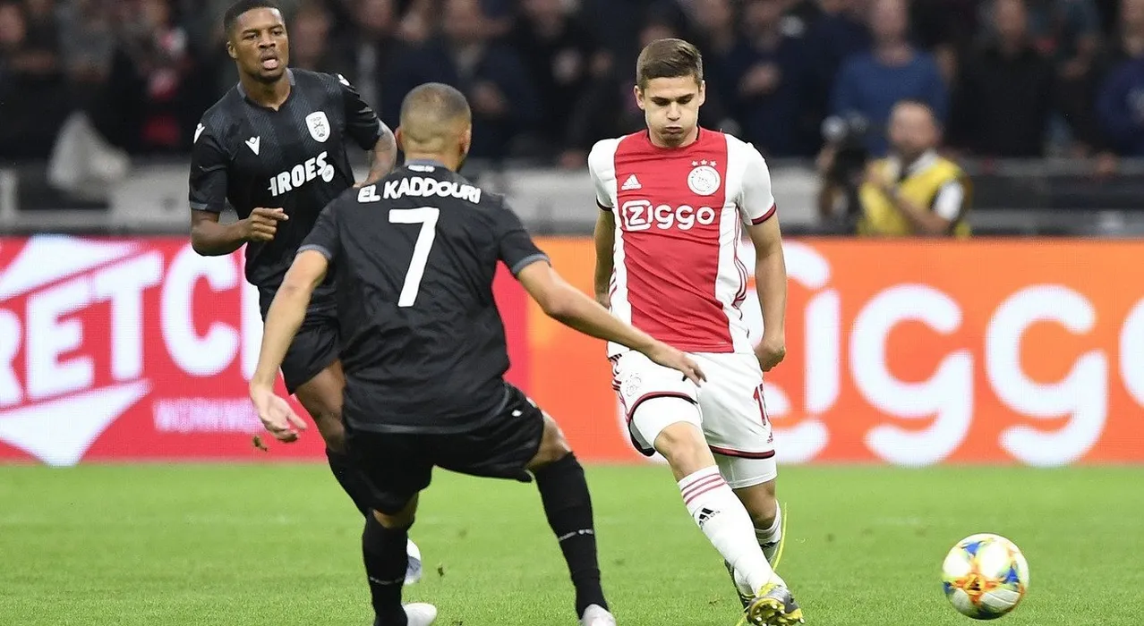 AMSTERDAM , 13-08-2019 , Johan Cruijff ArenA , Champions League third qualifying round season 2019-2020 , PAOK player Omar El Kaddouri and Ajax player Razvan Marin during the match Ajax - PAOK, Image: 465035815, License: Rights-managed, Restrictions: *** World Rights Except Austria and The Netherlands ***, Model Release: no, Credit line: Profimedia, ddp USA